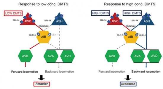 예쁜꼬마선충 머리에 위치한 개재신경세포는 인간의 대뇌피질처럼 감각정보를 통합하고 조절하는 기능을 한다. 연구팀은 선충의 개재신경 하나가 DMTS를 감지하는 각각의 감각신경세포에 연결되어 있고 저농도와 고농도의 DMTS 신호를 받아 처리하여 궁극적으로 농도에 따른 적합한 행동을 이끌어 낸다는 것을 규명해냈다.