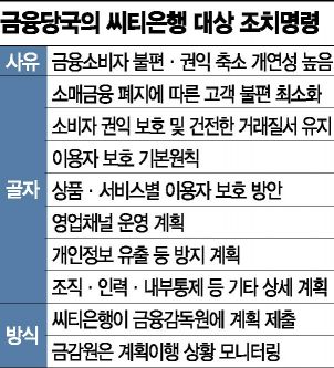 한편 이 같은 내용을 골자로 한 소비자보호방안 준수를 위해 씨티은행은 자체적으로 이행상황 관리체계도 구축 및 운영하기로 했다. 매월 이행상황 자체 점검을 실시하고, 그 결과는 이사회에 보고하도록 했다. 금융당국도 이행상황을 면밀히 점검하고 필요한 사항은 보완하도록 지도할 방침이다.