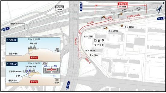 한남대교 남단은 강남대로, 경부간선도로, 압구정로에서 진입하는 차량들이 올림픽대로 하남·김포방향으로 서로 엇갈려 진입하는 구간이고 특히 진출입부 간의 이격거리가 40m로 매우 짧아 엇갈림 발생으로 사고위험이 높은 곳이다. 서울시는 이에 진출입부의 이격거리를 40m→200m로 대폭 확대해 급격한 차선변경으로 인한 사고위험이 없도록 개선한다.