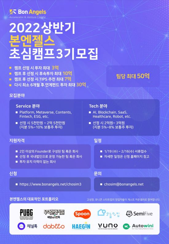 [아시아경제 김보경 기자] 초기 투자 전문 벤처캐피털이자 액셀러레이터인 본엔젤스벤처파트너스(본엔젤스)가 스타트업 발굴과 성장 조력을 위한 '초심캠프 3기' 참가기업을 모집한다고 18일 밝혔다.