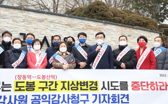 이날 공익감사청구를 위해 모인 ‘GTX-C 노선 도봉 구간 지상화 결사반대 투쟁위원회(위원장 허슬기)’ 주민대표들과 이동진 도봉구청장, 도봉구 인재근·오기형 국회의원, 시·구의원 등은 종로구 삼청동 소재 감사원 앞에서 지상화 반대 기자회견을 열어 성명을 낭독, 공익감사청구서를 제출했다.
