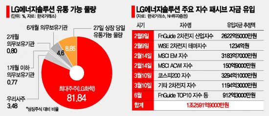 LG에너지솔루션의 1조원대 패시브 자금의 향방에도 관심이 커진다. 당장 내달부터 지수 편입 일정이 줄줄이 예정돼 있다. 지수를 통해 LG에너지솔루션에 유입되는 자금은 1조2592억원이 될 것으로 추정된다. 자산운용업계는 이 기간 LG에너지솔루션 주가 상승 사이클이 나올 수 있을 것으로 보고 있다. 다만 이 시기에 대형주의 매도 물량은 피할 수 없을 것으로 보인다. 몸집이 큰 대형주가 지수에 새로 편입되는 만큼 시가총액 상위 종목인 삼성전자에서 자금이 빠져나가는 상황도 불가피할 전망이다.