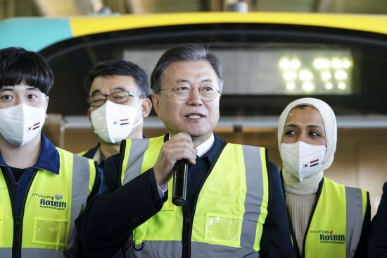 중동 3개국을 순방 중이던 문재인 대통령이 지난달 21일(현지시간) 이집트 카이로 엘살렘 차량기지를 방문해 현대로템이 공급한 전동차량 앞에서 방문 소감을 밝히고 있다. <사진=연합뉴스>