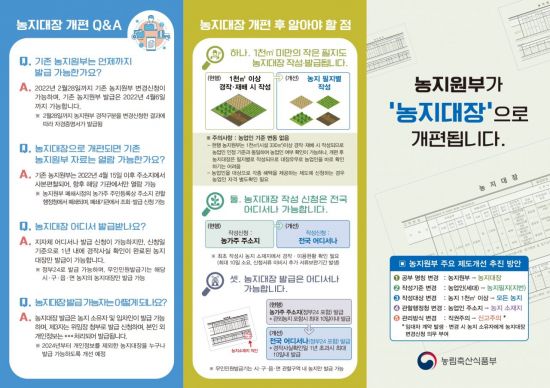 현행 농지원부는 농업인 기준으로 작성하고 있으나 2022년 4월 15일부터는 농지 필지별 기준으로 농지대장이 작성되며, 담당 기관이 농업인의 주소지에서 농지 소재지로 변경되고, 담당 기관이 직권으로 작성·관리하는 농지원부와 달리 신고주의를 적용한다.
