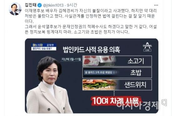 김진태 국민의힘 이재명 비리 국민검증특별위원장(춘천 갑 당협위원장)은 10일 SNS를 통해 "이재명 후보 배우자 김혜경 씨가 자신의 불찰이라고 사과했다. 하지만 무엇을 사과하는지는 침묵했다"고 반응했다.