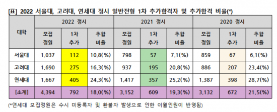 14일 종로학원이 2022학년도 정시 일반전형 1차 추가 합격자 현황을 분석한 결과에 따르면 올해 서울대의 1차 추가 합격자는 112명으로 지난해(57명)보다 55명이나 증가했다. 모집 정원 대비 추가합격 비율은 7.1%에서 10.8%로 증가했다.