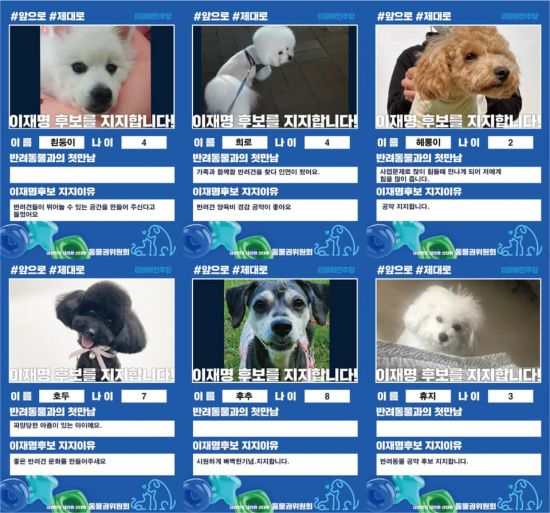 이는 이 후보 지지자들로부터 반려동물 사진과 이 후보 지지 이유, 사연 등을 받아 제작한 '지지선언 릴레이'다. 공개된 사진에 따르면 지지자들은 이 후보에 대한 지지이유로 "좋은 반려견 문화를 만들어달라", "반려견 양육비 경감 공약이 좋다" 등 의견을 밝혔다.