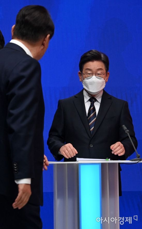 이재명 더불어민주당 대선 후보와 윤석열 국민의힘 대선 후보가 21일 서울 마포구 MBC에서 열린 중앙선거관리위원회 주관 첫 토론회에 참석, 눈 인사를 나누고 있다./국회사진기자단