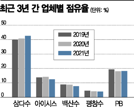 22일 닐슨코리아에 따르면 지난해 말 기준 국내 생수시장은 제주개발공사의 삼다수가 점유율 42.6%로 선두 자리를 굳게 지키고 있다. 이어 롯데칠성음료의 아이시스(12.4%), 농심의 백산수(7.7%), 해태htb의 강원 평창수(4.0%) 등의 순이다. 2019년 39.9%였던 삼다수의 점유율은 2020년 40.7%로 상승한 데 이어 지난해 2%포인트 가까운 추가 성장을 이뤄냈다. 이 기간 2~4위 사업자들의 점유율은 모두 축소되며, 1위와의 격차는 더욱 확대됐다.