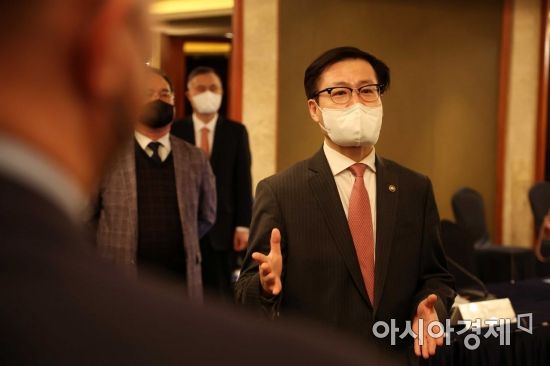 우크라이나 사태로 원자재 공급 차질 가능성이 대두되고 있는 24일 여한구 산업통상자원부 통상교섭본부장이 서울 중구 롯데호텔에서 열린 ‘원자재 공급망 협력 강화를 위한 간담회’에서 참석자들과 대화를 나누고 있다. 이날 간담회에는 인도네시아, 캐나다, 브라질, 아랍에미리트(UAE), 멕시코, 베트남, 말레이시아, 칠레, 필리핀 등 우리나라와 상호 의존성이 높은 9개 ‘자원부국’의 주한 대사들이 참석했다. /문호남 기자 munonam@