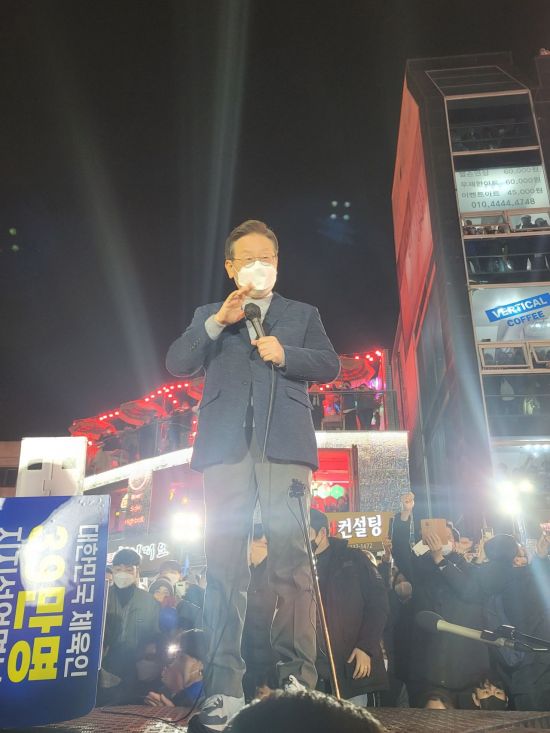 이재명 더불어민주당 대선 후보가 8일 청계광장 집중유세를 마친 후 홍대 앞에서 거리유세를 진행했다. 이 후보는 "대선 이후에도 다 함께 손잡고 살아야 한다"며 국민통합을 강조했다. / 사진=이기민 기자 victor.lee@