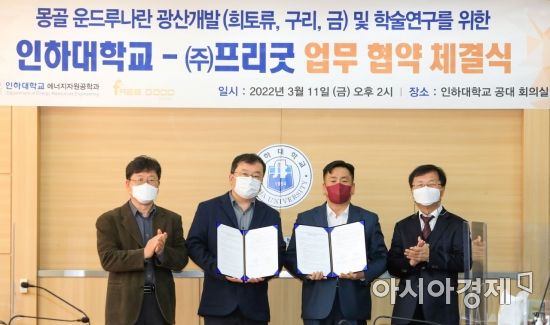 인하대는 에너지자원공학과와 ㈜프리굿이 몽골 운두르나란 광산 개발에 대한 공동 기술연구를 위해 업무협약을 체결했다고 13일 밝혔다.