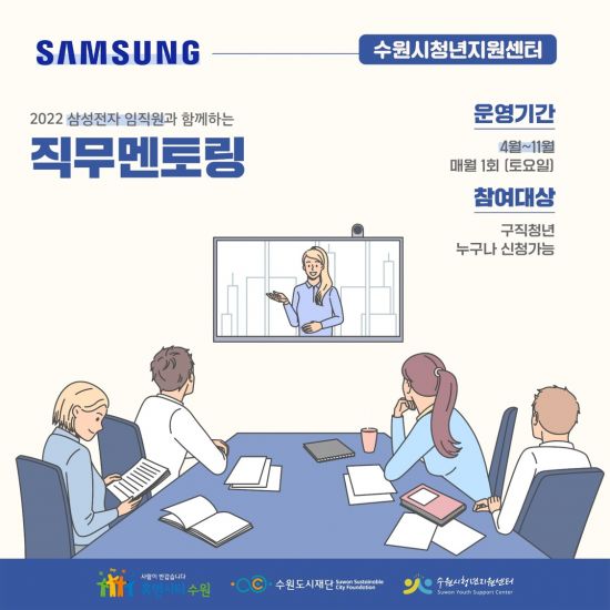 수원시 청년지원센터는 오는 4월부터 11월까지 '2022 삼성전자 임직원과 함께하는 직무멘토링'을 진행한다고 14일 밝혔다.