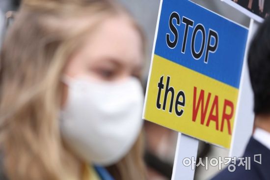 17일 서울 중구 주한 러시아대사관 인근 정동제일교회 앞에서 한국인권도시협의회 주최로 열린 ‘러시아의 우크라이나 침공 규탄, 우크라이나 지지 기자회견’에서 참가자들이 구호를 외치고 있다. /문호남 기자 munonam@