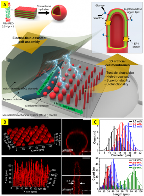 연구팀은 먼저 실리콘 기판 위에 지름 8㎛(마이크로미터) 크기의 홀 수 만 개를 규칙적으로 배열한 뒤, 표면처리를 통해 각각의 홀에 일정량의 블록코폴리머 용액을 넣어 건조시키는 기술을 개발했다. 이어 이를 삽입한 극미세 유채채널의 상부 판상 전극과 하부 실리콘 기판 사이에 전기력이 작용하는 전계(electric field)를 걸어 비눗방울 모양의 블록코폴리머 이중막 구조물을 만들었다. 이는 용액의 농도와 인가되는 전계 및 주파수에 따라 특정한 모습의 구조물이 유지되는 영역의 존재를 발견한 것으로, 비눗방울 같은 구형부터 튜브 같은 원통형까지 인공세포막의 크기와 모양을 마음대로 조절할 수 있는 길을 제시한 것이다.