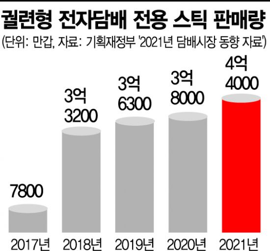 28일 기획재정부가 발표한 ‘2021년 담배시장 동향 자료’에 따르면 지난해 궐련형 전자담배 스틱 시장 판매량은 4억4000만갑으로 1년 전(3억8000만갑)보다 17.1% 증가했다. 전자담배 판매량은 2017년 7800만갑 수준에 불과했지만 이듬해 3억3200만갑으로 훌쩍 뛰어올랐다. 이후 2019년 3억6300만갑, 2020년 3억8000만갑으로 꾸준히 증가했고, 지난해 4억만갑을 돌파했다.