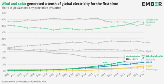 엠버는 지난해 세계 경제가 코로나19 침체 국면에서 벗어나면서 전력 수요가 급증했고 이 과정에서 태양광과 풍력 발전 비중이 처음으로 10%를 넘었다고 밝혔다. 지난해 태양광ㆍ풍력 발전의 비중은 10.3%를 기록해 2020년에 비해 1%포인트 상승했다. 풍력 발전 비중이 6.6%, 태양광 발전 비중이 3.7%로 집계됐다. 태양광ㆍ풍력 발전 비중은 파리기후협약이 채택된 2015년(4.6%)에 비해 두 배로 늘었다.
