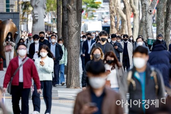 정부가 2년1개월만에 사회적 거리두기를 전면해제하기로 결정한 지난 15일 서울 강남구 테헤란로에서 직장인들이 마스크를 착용하고 출근길에 오르고 있다./강진형 기자aymsdream@