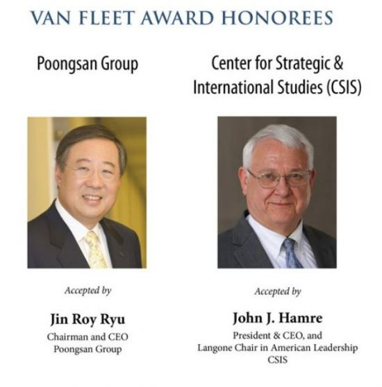 한미 친선 비영리단체 코리아소사이어티는 2일(현지시간) 2022년 밴 플리트 상 수상자로 풍산과 CSIS를 선정했다고 밝혔다. 한미 분야에서 가장 권위 있는 상 중 하나인 밴 플리트 상은 1992년부터 코리아소사이어티가 매년 한미관계에 공헌한 인물이나 단체에게 수여하고 있다.