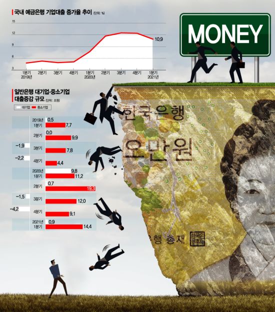 중소기업 대출 중에서도 개인사업자대출 증가액은 8조3232억원이었다. 전체 기업대출 증가액의 3분의 1을 차지하는 수준이다. 소상공인 대출이 대부분인데, 이들은 투자보다는 코로나19 사태로 인한 정책자금이 대부분이라는 게 은행 설명이다. 자영업자 대출은 부실채권 가능성이 다른 부문 보다 높아 은행에 부담"이라고 했다.