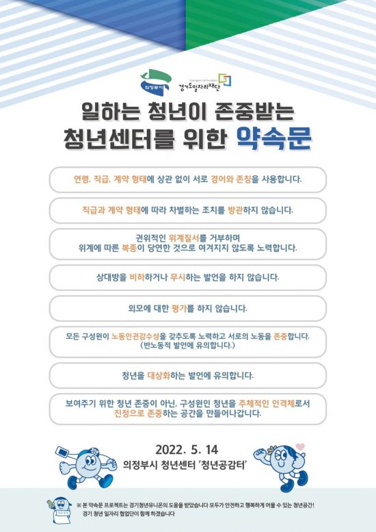 경기일자리재단은 14일 의정부시 청년센터 '청년공감터'에서 청년공간 현장간담회를 갖고 올해 경기도가 추진하는 청년 일자리 정책 안내와 함께 청년 공간의 청년 매니저 고용 불안정 문제 해소를 위한 대책 등을 논의했다. 또 청년들의 노동인권 보장 문화 확산을 위해 '일하는 청년이 존중받는 청년센터(공간) 약속문'을 전달했다.