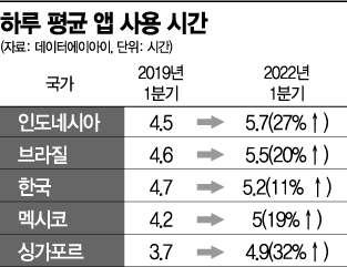 올해 1분기 기준 인도네시아 외 전 세계에서 하루 평균 5시간 이상 스마트폰을 사용하는 국가는 브라질, 한국, 멕시코 순으로 조사됐다. 한국의 경우 올해 1분기 1년 전보다 0.1시간 늘어난 5.2시간의 사용 시간을 기록하며 세계에서 3번째로 스마트폰을 오래 사용하는 국가로 조사됐다. 한국은 지난해 처음으로 하루 평균 스마트폰 사용 시간이 5시간을 넘어섰다.