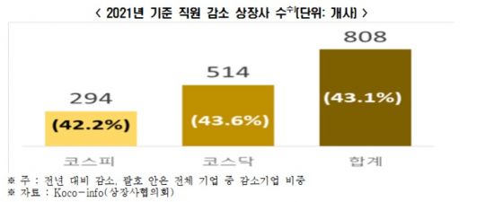 17일 전국경제인연합회(이하 전경련)가 2018~2021년 기준 비금융업 코스피·코스닥 상장사 1874개사)의 직원 규모를 조사한 결과 지난해 기준 상장사 10곳 중 4곳(43.1%, 808개사)은 전년도에 비해 직원 수가 줄어든 것으로 나타났다. 직원이 감소한 기업의 비중은 코스닥 시장이 코스피 시장보다 다소 높았다. 지난해 직원 수가 감소한 기업은 코스피 시장의 경우 조사대상 696개사 중 294개사(42.2%)였고, 코스닥 시장은 조사대상 1178개사 중 514개사(43.6%)였다.