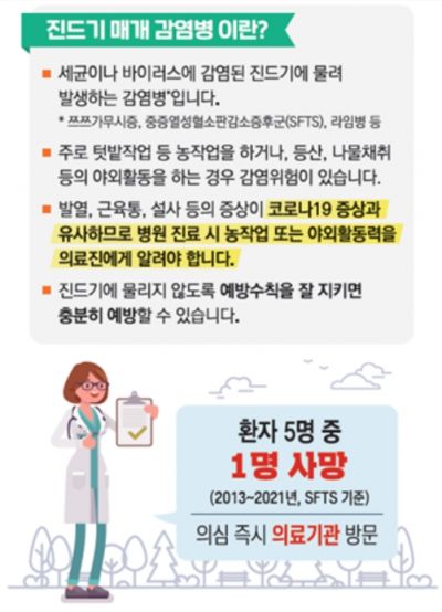 SFTS는 주로 4~11월 SFTS 바이러스를 보유한 참진드기에 물린 후 발병한다. 농작업과 제초작업, 산나물 채취 등 야외활동 증가로 인해 진드기 노출 기회가 많아지는 봄철에 발생이 증가하기 시작하며 열이 높게 나거나 오심, 구토, 설사 등 소화기 증상을 보인다. 특히, 치명률이 높은 데도 예방백신이나 치료제가 없어 특별한 주의가 필요하다.