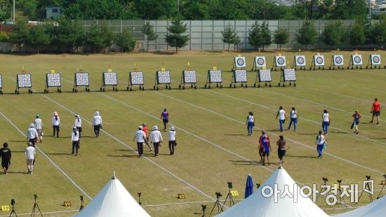 [아시아경제 호남취재본부 박준호 기자] 17일 오전 11시께 광주광역시 남구에 위치한 국제양궁장. 머리카락, 피부, 눈동자 색이 다른 각국의 선수들이 일렬로 서서 활시위를 당겼다.