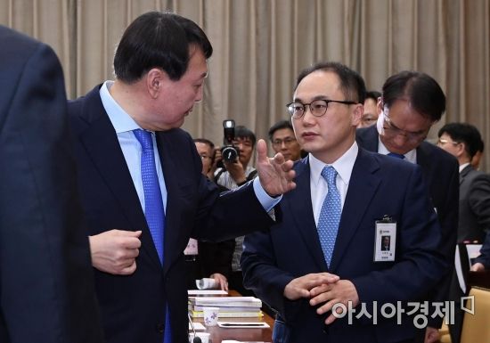 윤석열 검찰총장(왼쪽)이 17일 서울 서초구 대검찰청에서 열린 국회 법제사법위원회의 대검찰청에 대한 국정감사 오전 질의가 끝난 뒤 이원석 기획조정실장과 의원 제출 요청 자료에 대해 대화하고 있다./김현민 기자 kimhyun81@