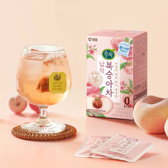 순작 납작복숭아차는 상큼하고 달콤한 맛의 스페인산 납작복숭아와 잘 어울리는 허브 블렌딩 베이스로 더욱 풍부한 향을 선사하는 제품이다. 콜드브루 방식을 적용해 납작복숭아 본연의 맛과 향을 살렸으며, 스테비아 잎으로 단맛을 내 칼로리 부담 없이 가볍게 즐길 수 있다.