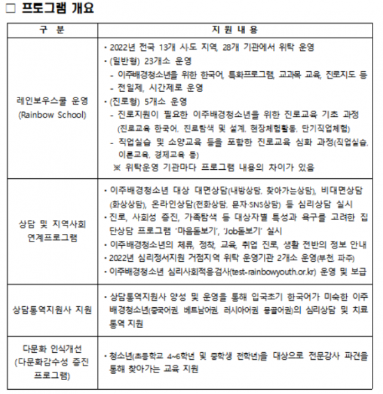 여가부는 언어장벽과 사회 적응·학업에 어려움을 겪는 만 9~24세 이하 이주배경 청소년을 위한 서비스를 지원한다. 한국어 교육과 편입학 등 진로·진학 교육정보와 외국인 등록과 체류, 국적취득 등의 정보를 제공한다. 전국 13개 지역 레인보우 스쿨에서 한국어와 특화프로그램, 진로지도 등을 지원한다. 한국어교육은 올해부터 기초·심화 등 수준별 과정을 편성하고 진학준비, 진로특화 등 참여자의 목표에 맞게 프로그램을 개편해 지원하고 있다.