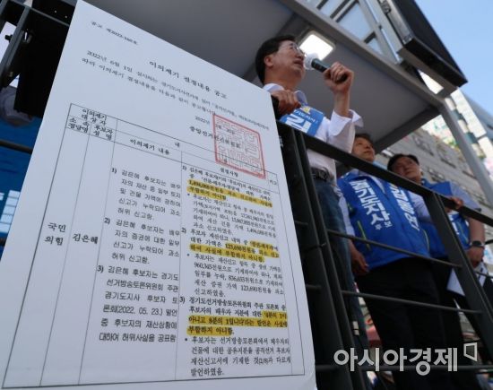 6.1 지방선거를 하루 앞둔 31일 김동연 더불어민주당 경기도지사 후보의 경기도 부천 역곡남부역사거리 유세 현장에 중앙선관위의 김은혜 국민의힘 후보 재산축소 공고문이 붙어 있다./부천=윤동주 기자 doso7@