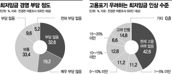 최저임금이 얼마나 인상되면 직원 고용을 포기하거나 기존 직원 해고를 고려할 것이냐는 질문에 자영업자의 42.6%는 현재도 고용 여력이 없다고 답했다. 이어 1~5% 미만 인상 시 11.2%, 5~10% 미만 인상 시 11.2%가 고용을 포기하거나 기존 직원 해고를 고려하겠다고 응답했다.