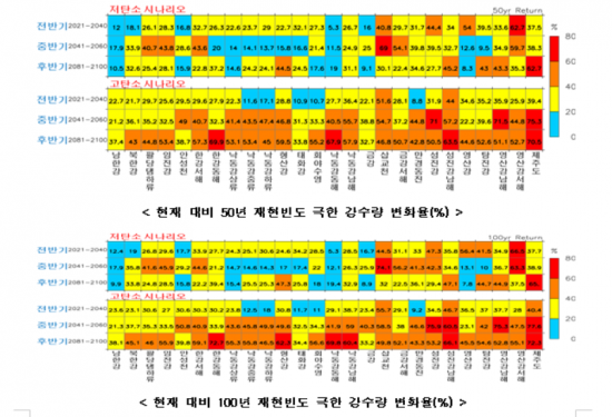탄소배출량이 유지될 때 100년에 한번 나타날 극한 강수량 변화율이 50% 이상인 권역 수는 21세기 후반기에 최대 16곳에 달할 것으로 전망된다. 한강 동해권역은 73%, 낙동강 동해권역은 69% 늘어날 것으로 예상된다. 증가폭이 가장 큰 제주도 권역은 20년 후인 2041~2060년에 이미 78%까지 극한 강수량이 늘어날 것으로 분석됐다.