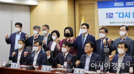 22일 국회에서 열린 더불어민주당 '을지로위원회 아침특강 - 다시 일어서는 을지로위원회' 포럼에 참석한 진성준 을지로위원회 위원장과 우원식 의원 등 참석자들이 파이팅을 외치며 기념촬영을 하고 있다./윤동주 기자 doso7@
