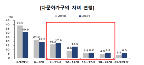 27일 여성가족부가 다문화가구 1만5578가구를 대상으로 실시한 '2021년 전국 다문화가족 실태조사' 결과에 따르면 전체 다문화가족 자녀 연령 중 만 9~24세 비율이 43.9%로 나타났다. 직전 조사인 2018년보다 8.3%p 증가했다.