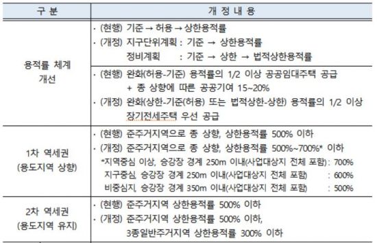 용적률 적용 체계도 법령에 맞게 개선해 법적 정합성을 높였다. 기존 모두 국토계획법에 따른 지구단위계획 용적률 체계를 따르고 있으나 도시정비형 재개발사업은 '도시정비법'에 따른 용적률 체계를, 주택건설사업은 기존 방식으로 이원화했다.