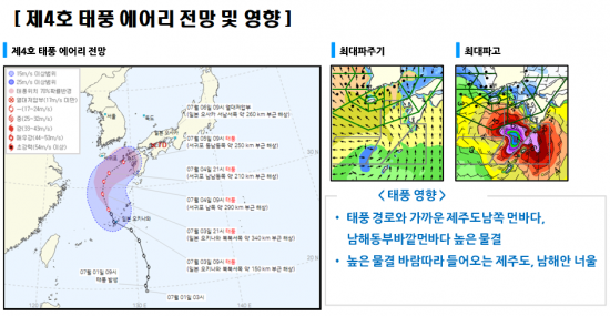 4호 태풍 에어리는 4일 9시 서귀포 남쪽 290km 해상을 지나 7월5일 서귀포 동남동쪽 해상 250km 부근을 통과할 것으로 예상된다. 6일 9시에 열대저압부로 약화되면서 오사카 서남서쪽 260km 부근 해상으로 빠져나갈 것으로 전망된다.