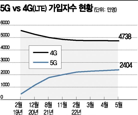 5G 서비스 가입자 수는 2019년 466만8154명에서 2020년 1185만1373명으로 증가했고, 2021년 11월 2000만명을 돌파했다. 반면 4G 서비스 가입자 수는 꾸준히 감소 추세를 이어가고 있다. 2019년 5568만7974명이었던 가입자 수는 지난해 9월 5000만명 밑으로 내려앉았고, 지난 5월 말 기준 4738만9108명을 기록했다.