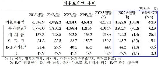 한국은행이 5일 발표한 '6월 말 외환보유액' 통계에 따르면 우리나라 외환보유액은 4382억8000만달러로 전월말 대비 94억3000만달러 줄었다. 2020년 11월(4363억7700만달러) 이후 1년7개월 만에 최저치다