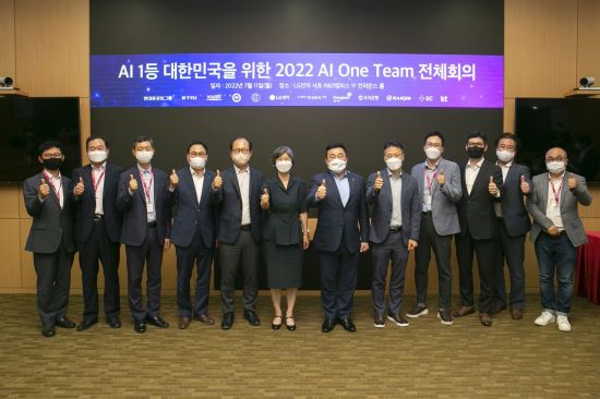 2022 AI원팀 전체회의를 마치고 참여기관 주요 인사들이 기념사진을 촬영하고 있다. 왼쪽부터 한국투자증권 신봉관 상무, 한진 강신길 전무, ETRI 이윤근 소장, 동원그룹 서정원 본부장, 성균관대학교 이지형 원장, 한양대학교 백은옥 교수, KT AI/DX융합사업부문장 송재호 부사장, LG전자 김병훈 부사장, 우리은행 옥일진부행장, 현대중공업그룹(한국조선해양) 김성준 부사장, GC(녹십자홀딩스) 이진천 실장, KAIST 정송 원장.