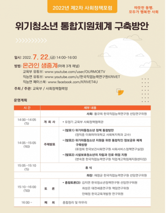 이번 공개토론회에서는 코로나19 등 위기에 취약한 청소년에 대한 지원 방안을 모색하고, 청소년 위기 요인별 맞춤형 지원을 위한 지원 체계 구축 방안을 논의할 계획이다.