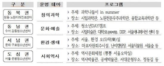 캠프 프로그램은 권역별(동북·동남·서남·도심)로 운영된다. △창의과학 △문화·예술 △생태·환경 △사회역사 등 4가지 테마를 중심으로 지역의 특성 및 청소년의 관심사 등을 반영해 다채로운 코스로 구성했다.
