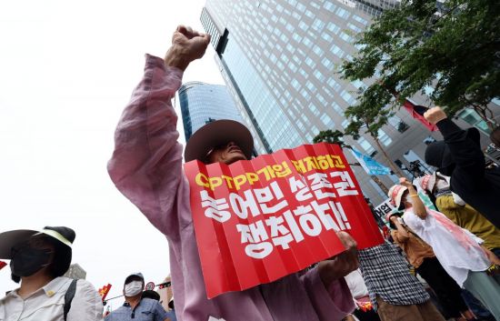 문제는 그 사이 CPTPP의 관세철폐율을 놓고 농어업계 반발이 거세졌다는 점이다. CPTPP의 농수산물 관세철폐율은 96.1%로 사실상 전면 개방에 가깝다. 한국농촌경제연구원(KREI)은 CPTPP 가입시 15년 동안 농축수산업 생산이 연간 최대 4400억원 감소할 것으로 내다봤다. 이에 농어업계 등 101개 단체는 이달 12일 서울 용산에서 CPTPP 가입을 반대하는 대규모 집회를 열기도 했다.