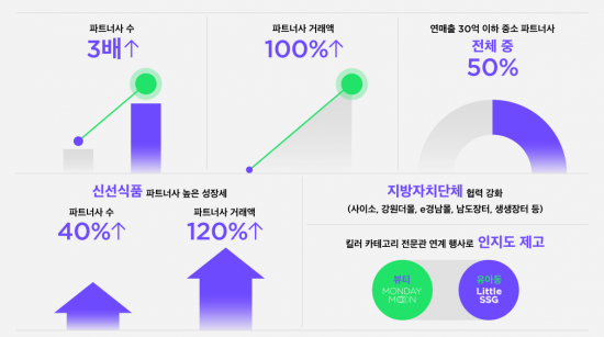 가장 성장폭이 높은 파트너사 유형은 과일, 정육, 채소 등 신선식품을 판매하는 곳이었다. 올해 상반기 기준 2019년 대비 입점 파트너사는 40% 늘었고, 전체 거래액은 120% 증가했다. 메인 화면에 상품 노출을 확대하고 랜더쓱데이, 스마일클럽 전용딜 등 대형 프로모션 진행 시 파트너사 상품을 적극 반영한 것이 주효했다.