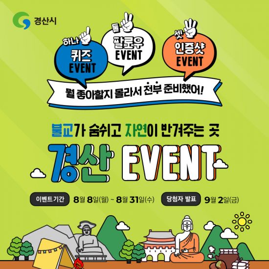 [아시아경제 영남취재본부 여종구 기자] 경북 경산시는 오는 10월 31일까지 경산시 인스타그램을 활용해 경산관광 감성마케팅 SNS 관광 이벤트를 진행한다고 밝혔다.