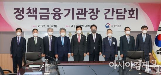 2일 서울 종로구 정부서울청사 금융위원회에서 열린 정책금융기관장 간담회에서 김주현 위원장(왼쪽 다섯번째)등 참석자들이 기념촬영을 하고 있다. 쪽부터 최준우 주택금융공사 사장, 김태현 예금보험공사 사장, 윤희성 수출입은행 행장, 윤종원 기업은행장,김주현 금융위원장, 강석훈 산업은행 회장, 윤대희 신용보증기금 이사장, 권남주 자산관리공사 사장, 이재연 서민금융진흥원 원장./김현민 기자 kimhyun81@
