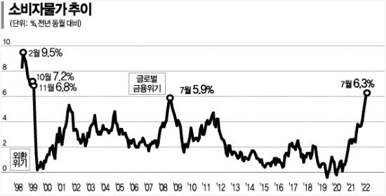 ◆올해 물가 5%대 눈앞= 과거 두 번의 경제위기 때 물가를 살펴보면 환율 급등으로 외환위기 당시 1998년 2월 물가 상승률이 9.5%까지 치솟았다. 글로벌 금융위기였던 2008년 7월에도 물가 상승률이 5.9%까지 뛰었지만 6%대를 기록한 현재보다는 낮은 수준이었다. 올해 1~7월 소비자물가는 지난해 같은 기간 대비 4.9% 올랐는데, 9~10월 물가가 정점에 다다를 것으로 예측한다면 올해 소비자물가 상승률은 정부 전망치인 4.7%를 상회해 5%를 넘어설 것으로 보인다. 연간 물가 상승률이 5%를 넘은 건 외환위기였던 1998년(7.5%) 이후 없었다. 2008년에도 물가 상승률이 4.7%였던 점을 감안하면 올해 물가 상황은 이례적으로 높은 수준이다.
