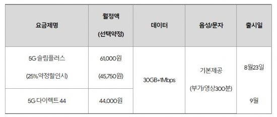 앞서 SK텔레콤은 월 5만9000원에 데이터 24GB를 제공하는 '베이직플러스' 요금제와 온라인 전용 요금제로 월 4만2000원에 데이터 24GB를 제공하는 '5G 언택트 42'를 출시하고 지난 5일 판매를 시작했다.